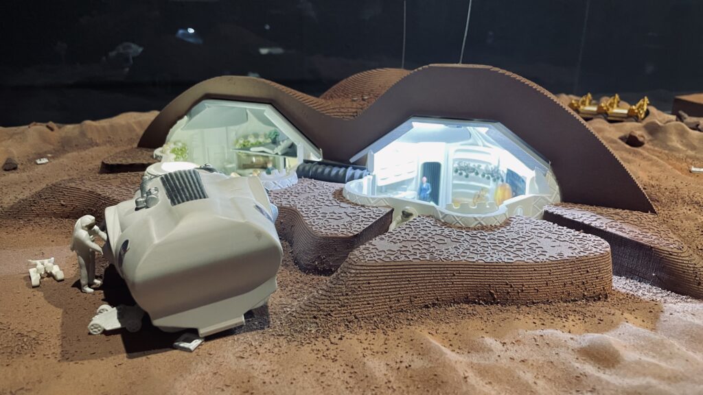 這個發想也是利用3D列印機器人與火星當地的砂土來建造能提供人類障蔽的居住環境。