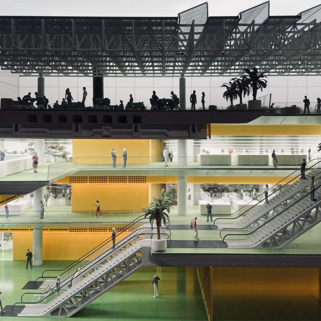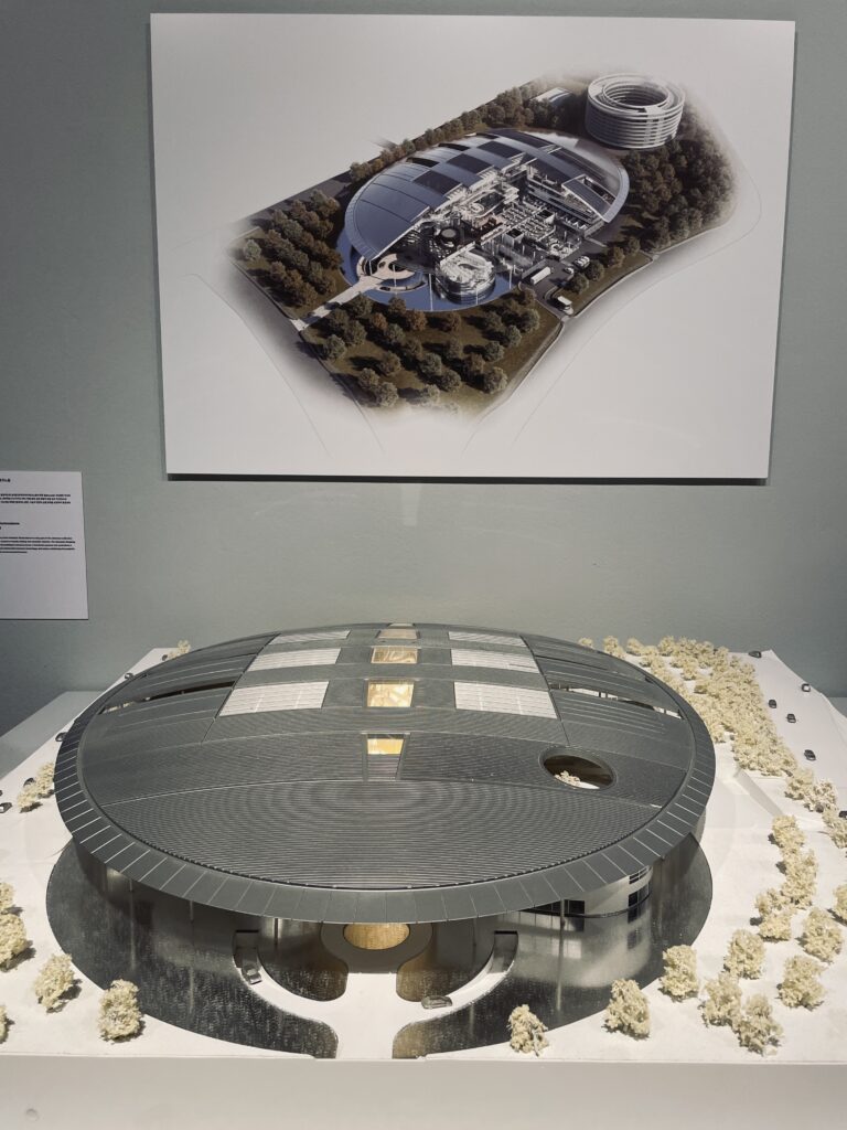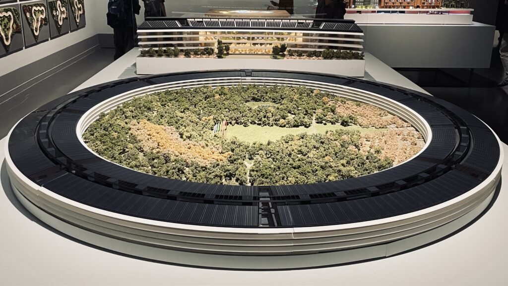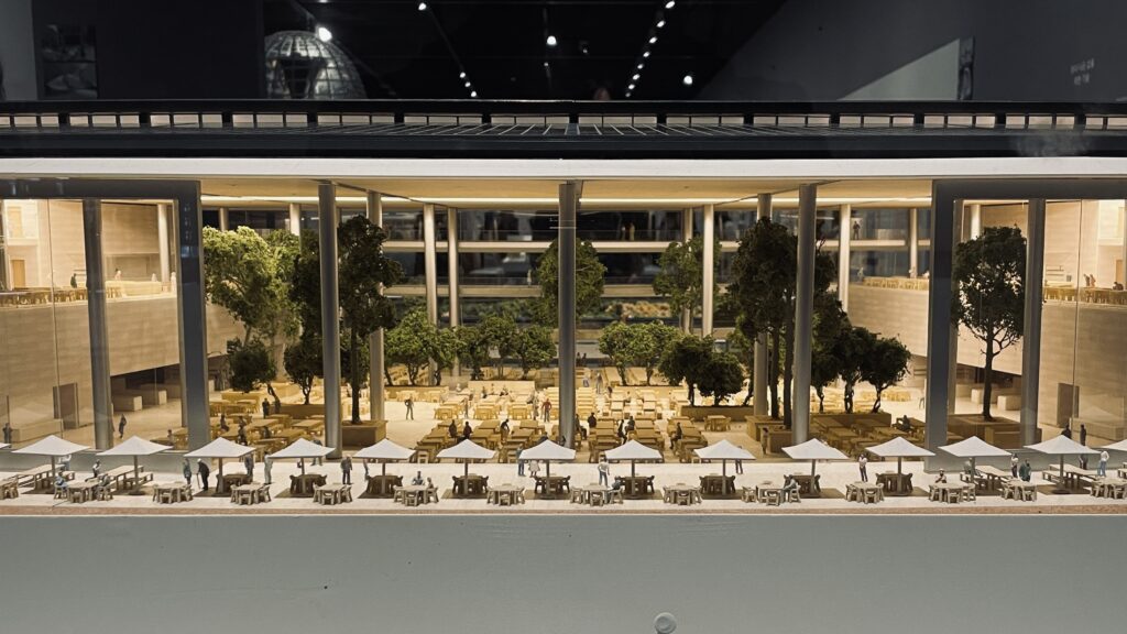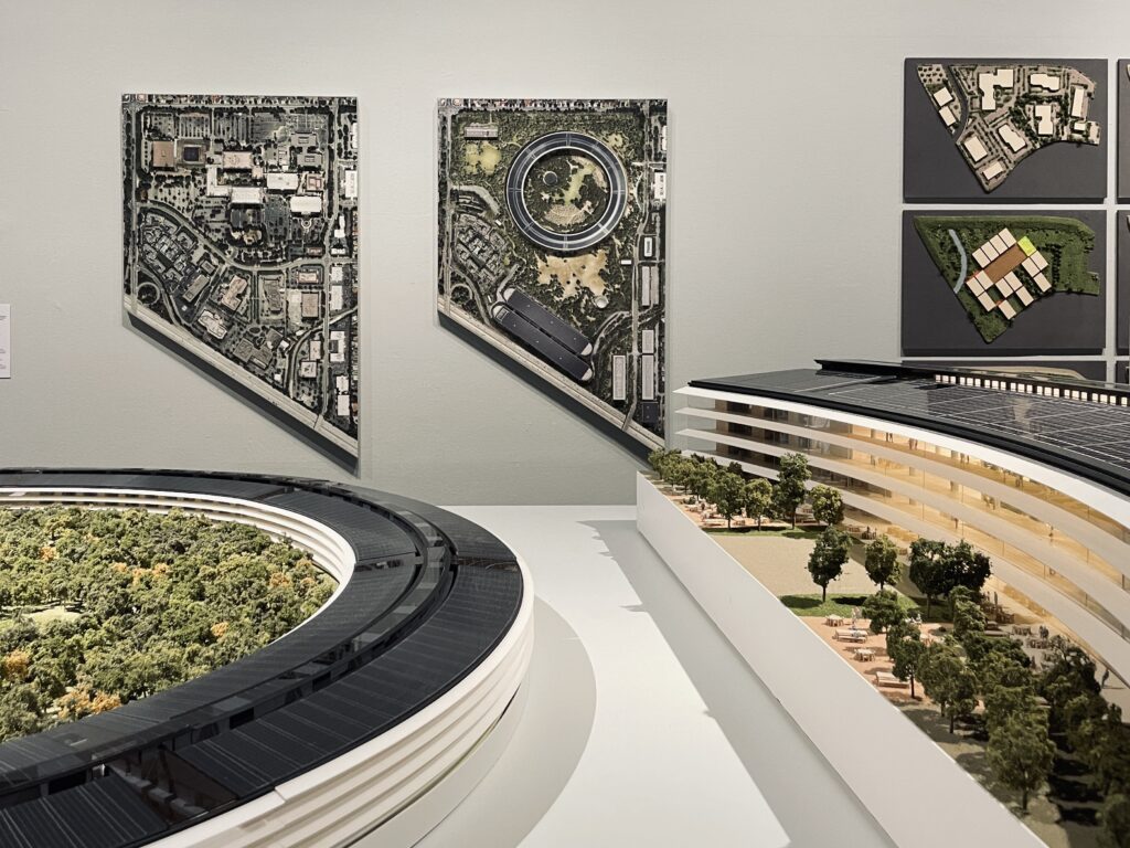 這次展出的模型們是不是真的都非常巨大、非常痛快呢(笑)這個與Steven Jobs一起設計的蘋果園區有著大膽又夢幻的太空船設計(?)在建造時用了大量的回收水泥等建材(原本該區由很多個分散的小建築物組成,before的平面圖可見下下欄)佈滿屋頂的太陽能版及天然氣燃料電池能夠產生足夠(甚至多於)園區使用的能源,中央的花園也是由加州當地的植物來做造景;建築物內維持Foster一貫的開放式平面、幾乎沒有任何樑柱支撐,整個建築由無數的曲形玻璃帷幕包圍,內部除了有辦公空間外也有很多提供員工使用的休憩空間,還有每次蘋果新產品發表會時會出場的Steven Jobs Theater。