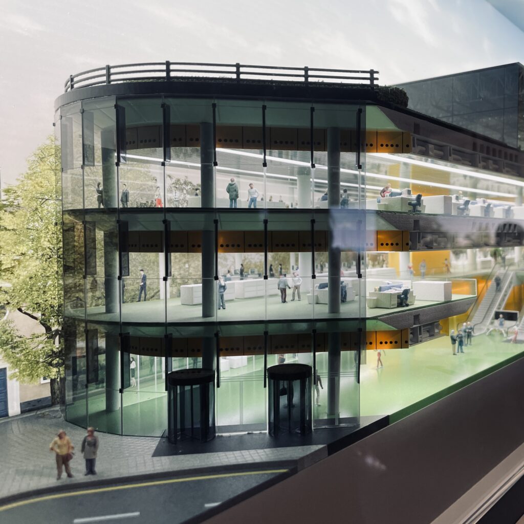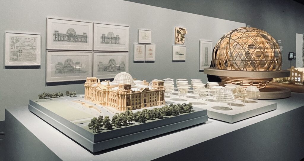 下面可以看到的是國會大廈的整體模型及穹頂的部分模型、設計過程中使用的多個設計模板,以及下圖中的後方懸吊著的則是玻璃椎體的樣版模型。