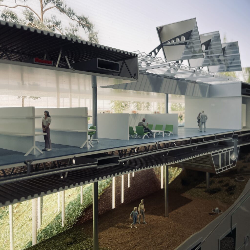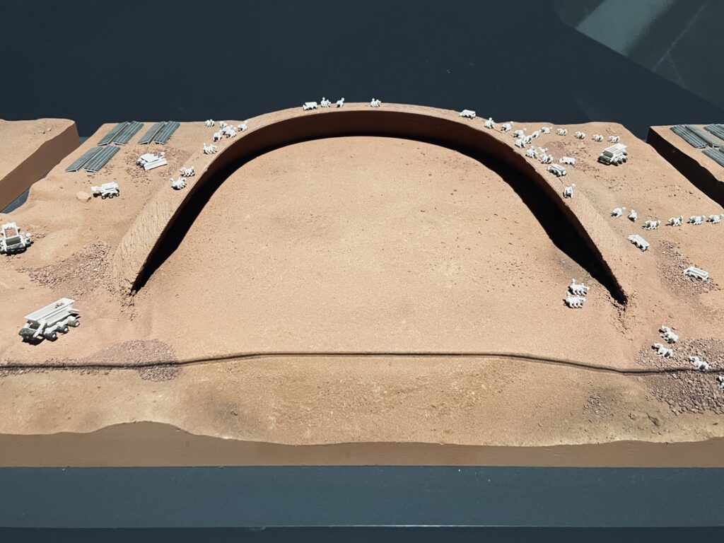 上圖一是位在阿布達比的Zayed National Museum ,目前還在興建預計於2025年開幕。導覽員特別提到在Foster+Partner收到客戶委託時,其中一個要求是這棟建築物要能夠承襲祖先的智慧:博物館內部不能使用冷氣(!)也要是棟綠建築、能達到0碳排放。於是在博物館上方站立著的幾個造型物不只是為整體設計增加亮點,還肩負著非常重要的任務:他們的大小及角度符合附近氣流流向、能把風向下導入室內,而造型物的頂端使用一種特殊金屬,能把熱往上吸往上排放以降低流入室內的氣流溫度,博物館周圍也有水景環繞,期待能利用水來拉低整個園區的熱度。總之這也是個利用尖端的高科技建築手法設計的博物館,至於事實上降溫的效果如何也就只能待竣工之後讓大家去驗收了。