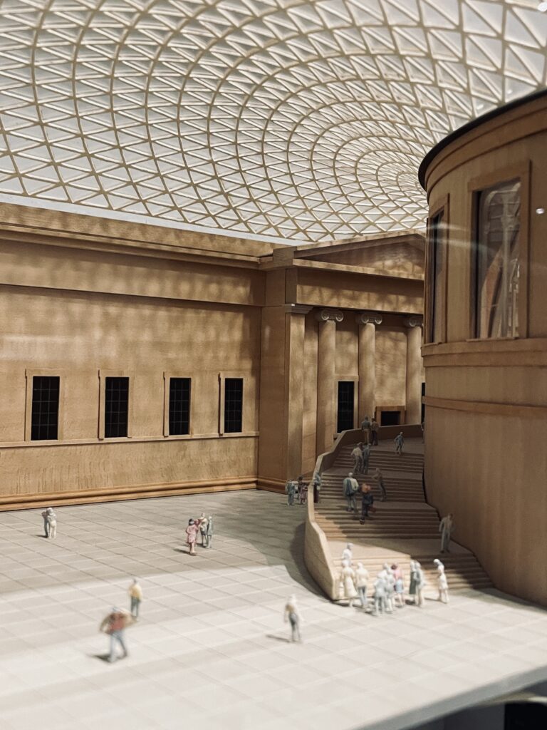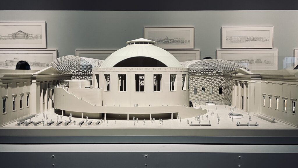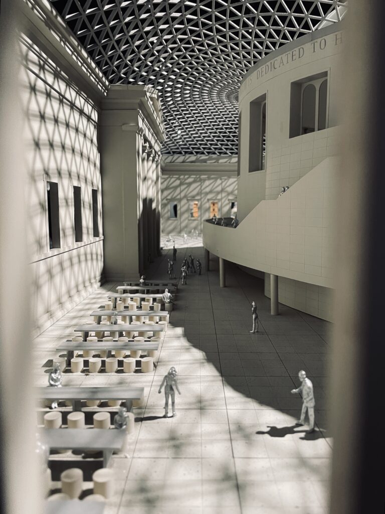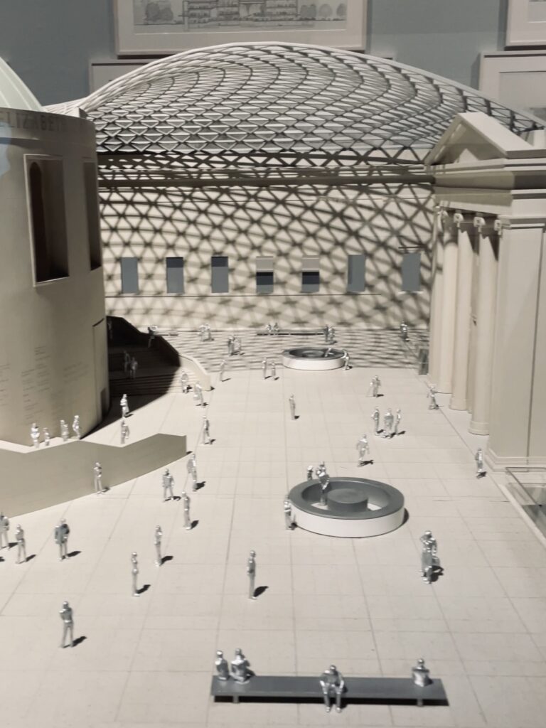 Foster在原本的室外中庭之加上了流線型的玻璃屋頂,使用高科技建築手法讓玻璃能承受溫度變化也不會受雨及雪的摧殘;此舉不僅大大地增加了博物館能使用的平面空間,也創造出能裝進巨大裝置藝術作品的場所,更將原本難以利用的室外空間轉變成整個博物館的心臟地帶。