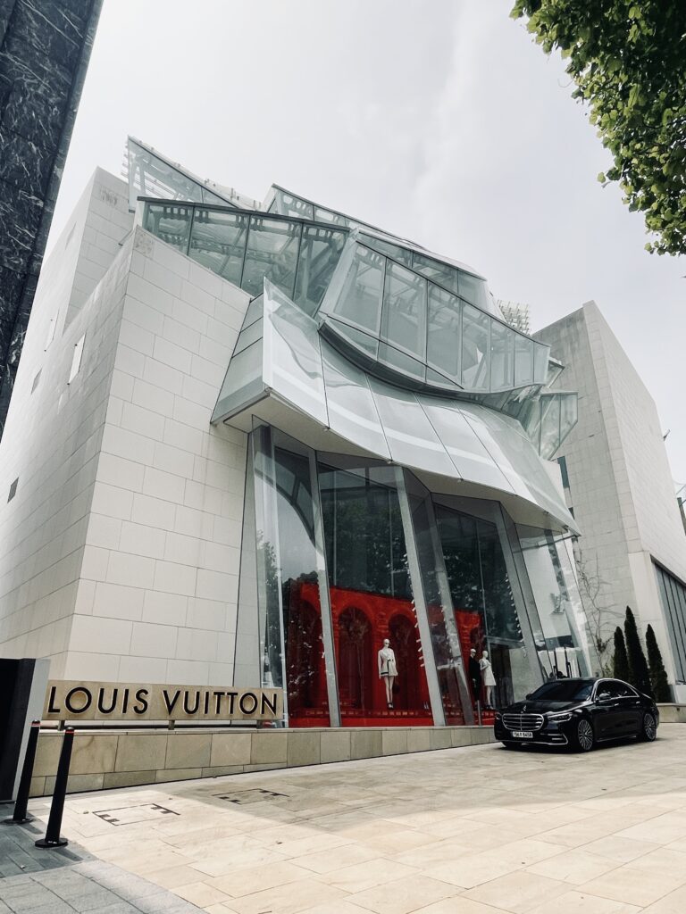距離松隱藝術中心步行約五分鐘、位於清潭洞狎鷗亭路上的LV旗艦店Maison Seoul是以獨特風格聞名的建築師Frank Gehry的作品。Maison Seoul的設計不僅延續了巴黎路易威登基金會美術館的風格, 建築師更將UNESCO世界文化遺產之一的水原華城以及韓國傳統舞蹈東萊鶴舞的舞步與白色舞衣作為靈感,將韓國本土文化與LV品牌語彙做巧妙的連結、反映在建築物外型上。