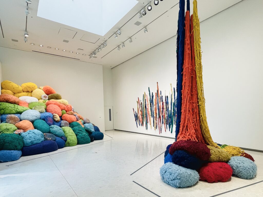 Atterrissage(2014)由兩個部分組合而成:像是由彩虹變身成為的七彩繩索們從天花板上如瀑布般垂下,散落在地上的一個個大塊針織團塊上。藝術家選用的鮮豔色彩們雖易讓人聯想到繪畫,但作品巨大又獨特的形狀則像是在向世人宣告自己是如同紀念碑一般的存在。