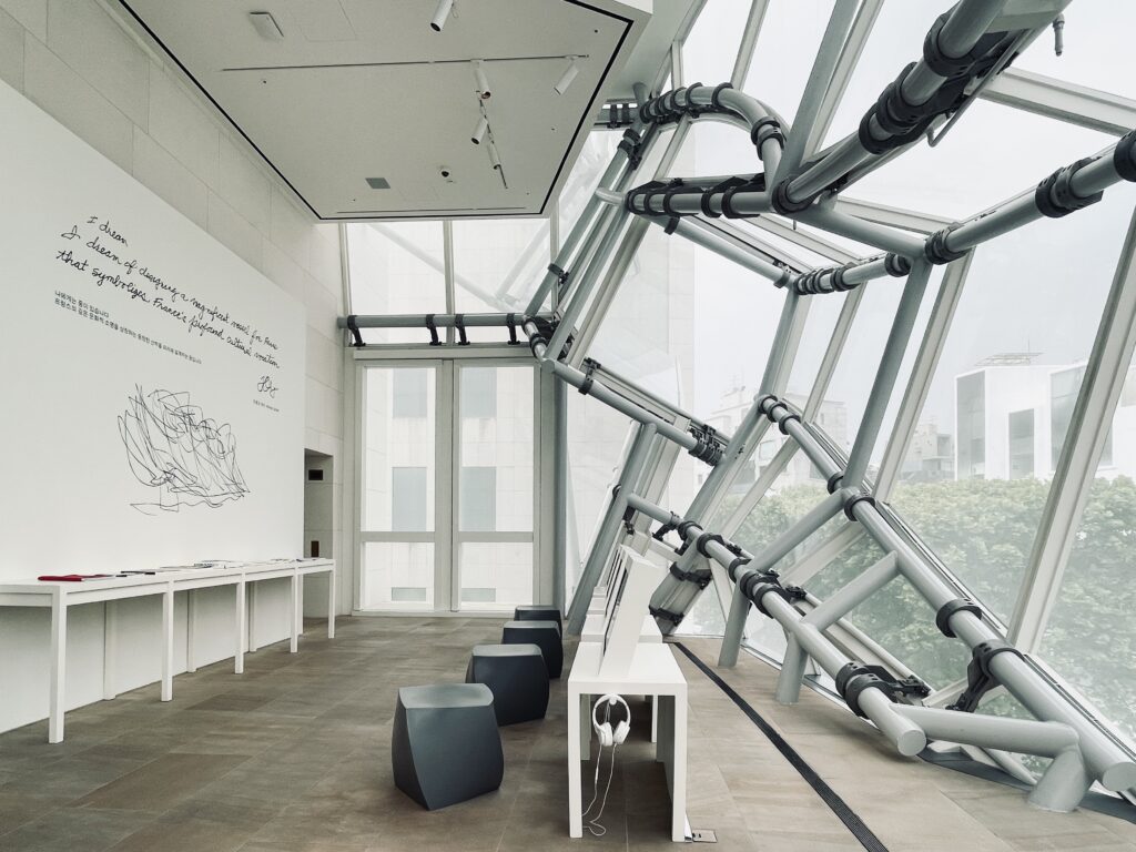 與許多其他國家的LV旗艦店一樣,首爾也設置了專門展出LV基金會藝術收藏的「路易威登藝廊」Escape。藝廊位於建築物的四樓,從店面右側的入口進入後馬上能看見右手邊有電梯可以直接上樓(需要職員刷卡電梯才能啟動),路線跟一般客人幾乎不會重疊,因此即使沒有要消費也可以不用有壓力。上到四樓、經過簡單的接待櫃檯後進入的空間就是藝廊了。由於位在建築物的頂樓、外面還有半室外的露台,展覽空間並不大,但天花板挑的很高、中間有天井、整體採光非常好,也很適合展出各種非典型大小的現代藝術作品。