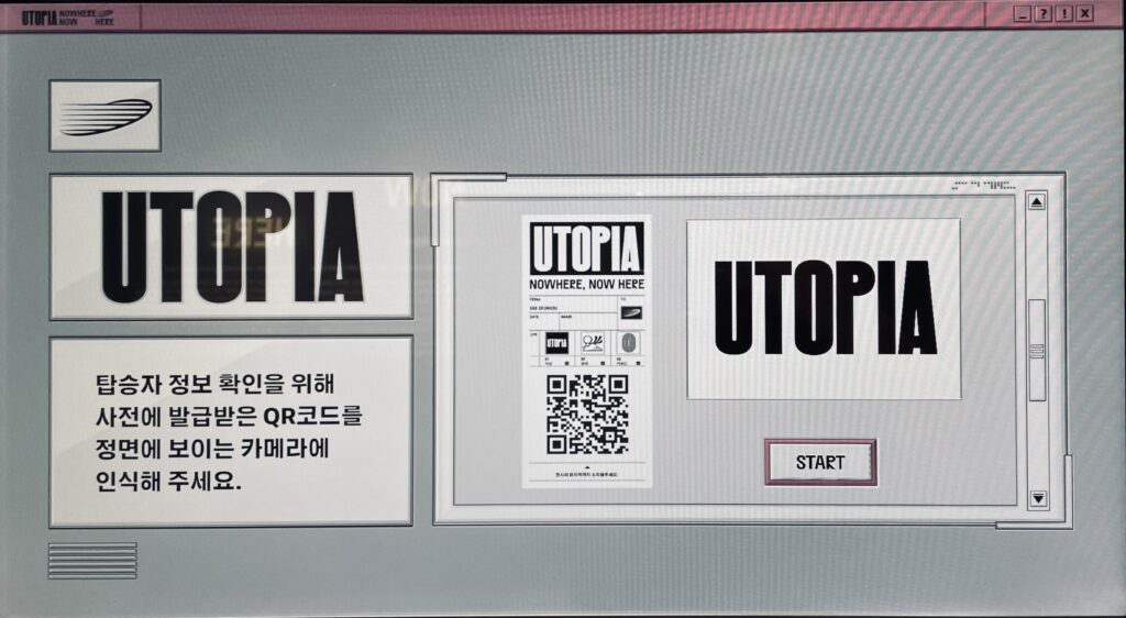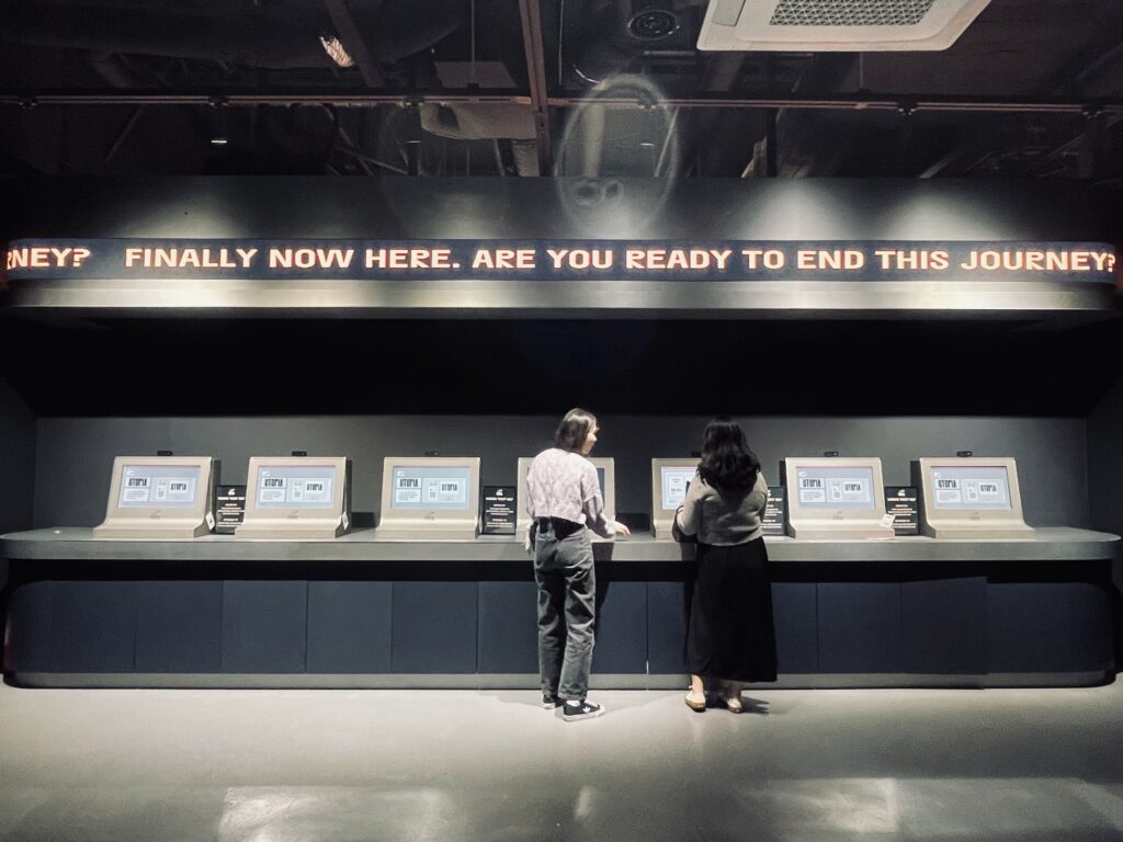 最後一站則是回到跟一個第一站長得一樣的房間,掃描一開始拿到的票上QR code之後,電腦會先顯示出我最一開始選的選項們,再讓我挑出看完展後自己覺得最符合烏托邦的作品,然後計算出我選的關鍵字是否跟作品屬性有符合。老實說我選了兩次,兩次都是完全不符合,只能說可能我的詮釋或理解跟製作單位相差甚遠吧(笑)