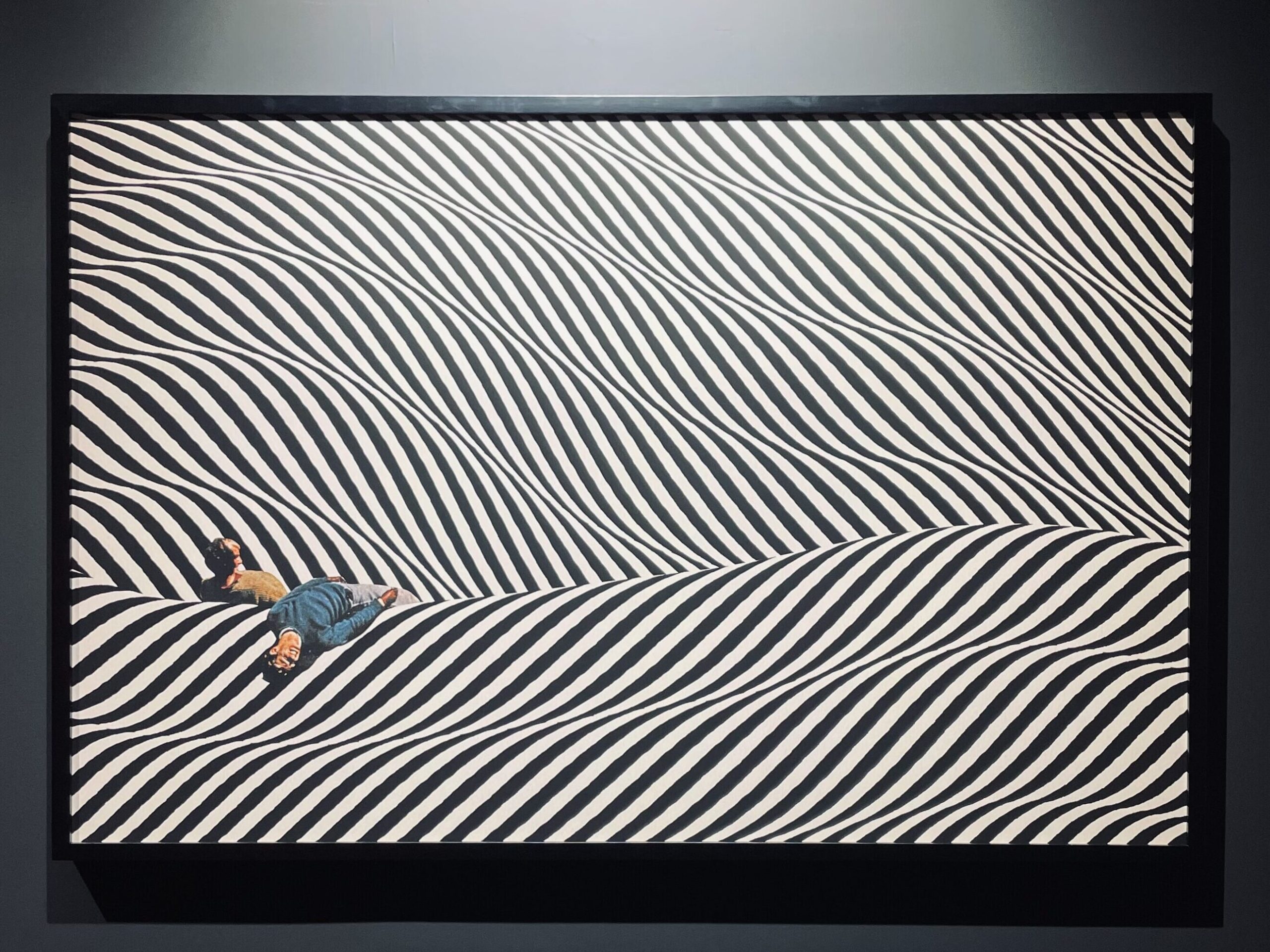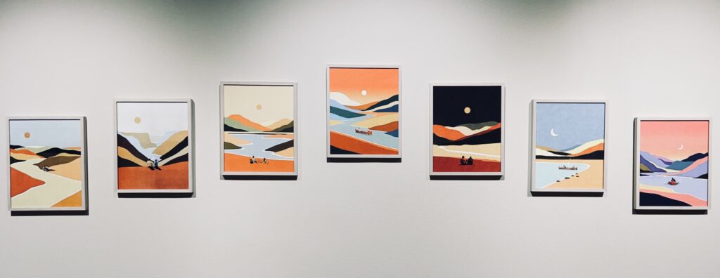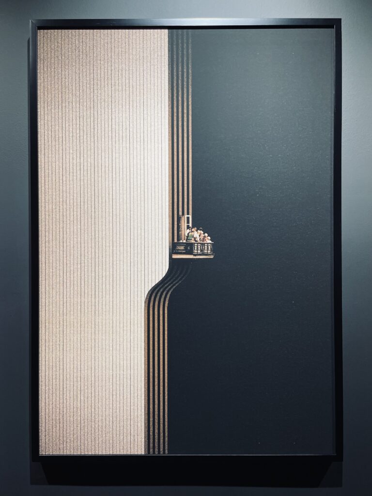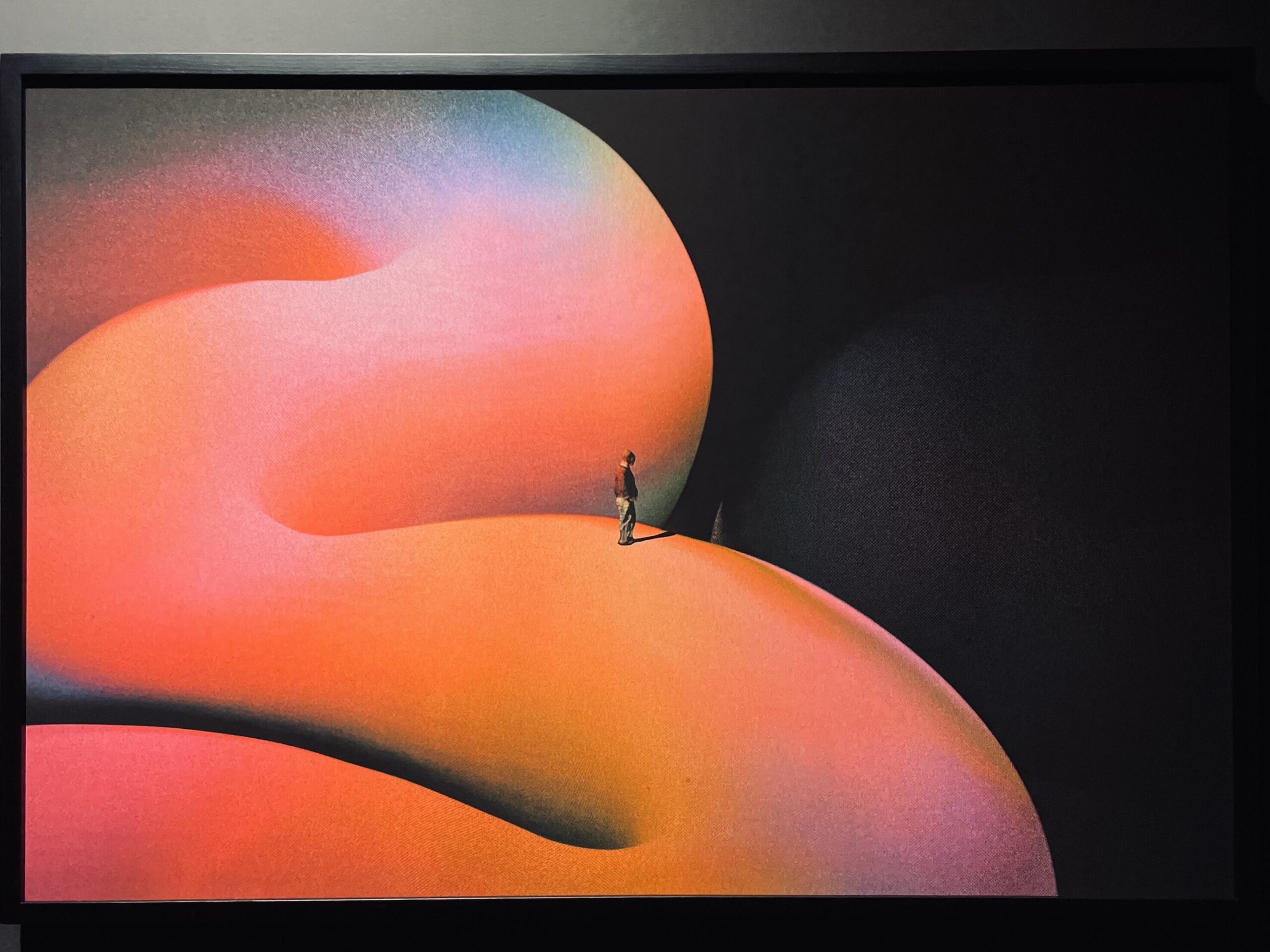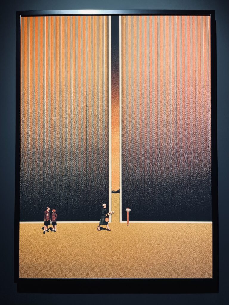 這次看展的驚喜之一就屬Valentin Pavageau了。非現實的內容,簡潔大氣的構圖,不管是色調或明暗對比都清晰且強烈,創造出一種非常獨特的夢境感受;尤其是他利用線條營造出的空間感、曲線感有一種莫名的拉力、像是要把人一手拉近他所創造出來的世界一般;再加上他畫中人物較小、周遭環境或建築物的設計既巨大又極簡,所以畫作本身雖然不大,但畫裡的世界彷彿無限寬闊、無邊無際。