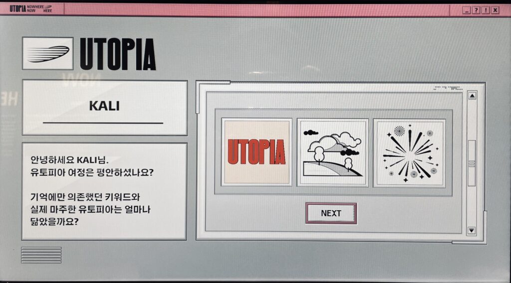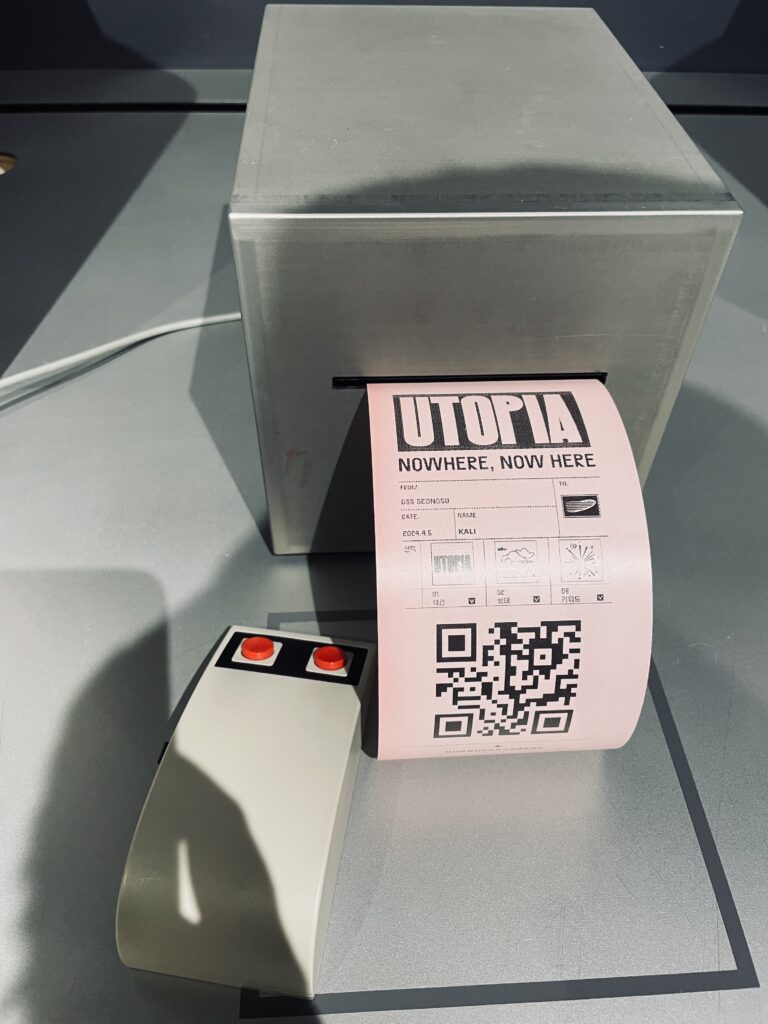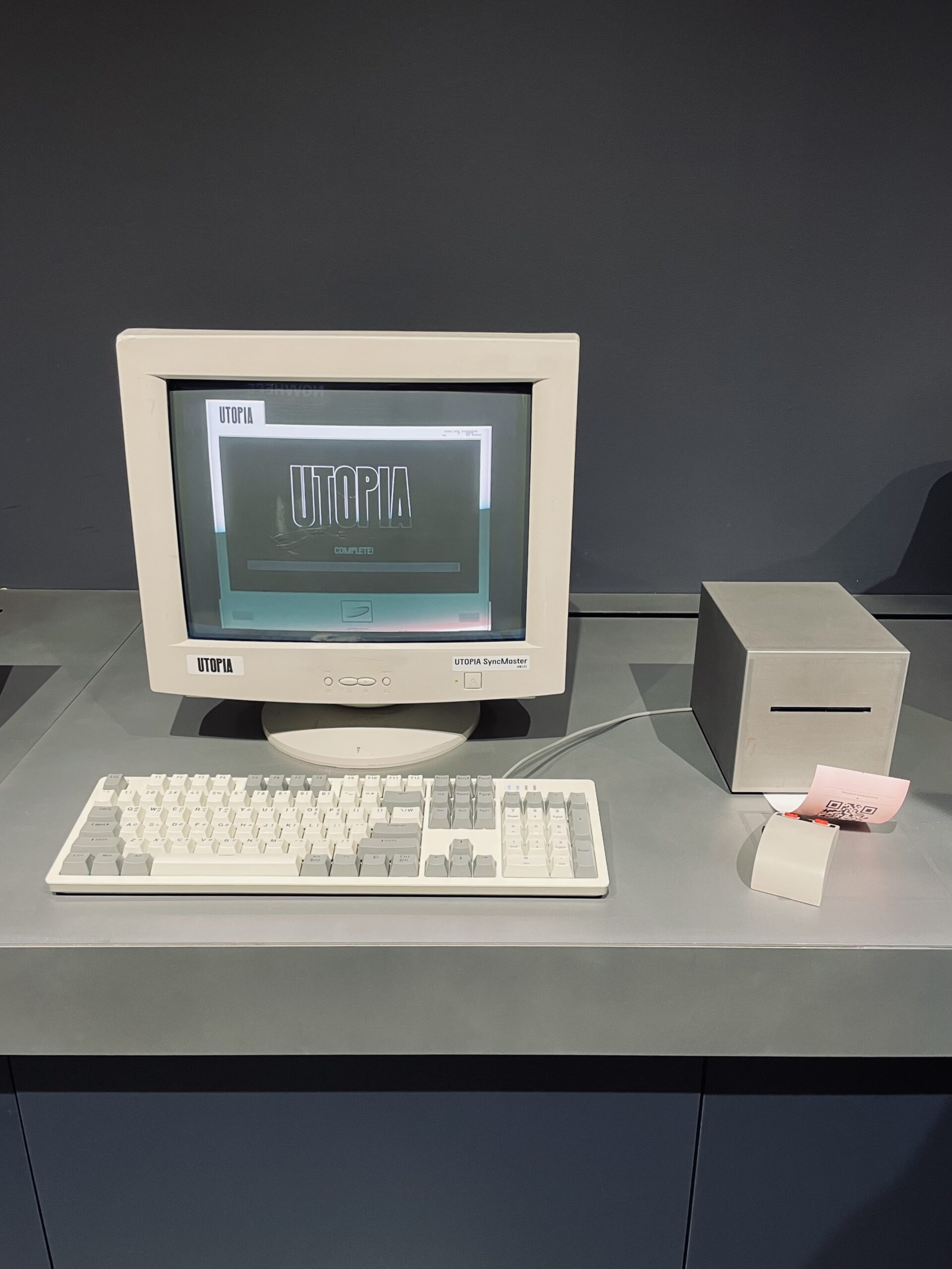 第一站是一個有很多舊式電腦的房間(他們到底是怎麼找到這麼多台長一摸一樣的舊式電腦的?!) 依照指示先輸入名字,然後進入選擇題,有顏色、狀態、及關鍵字三題,每題都有幾個簡單的圖像可以選,限時(應該是)二十秒內要選出符合自己想像中烏托邦的意象,最後機器會印出一張收據,拿了之後就可以進入下個房間開始看展。