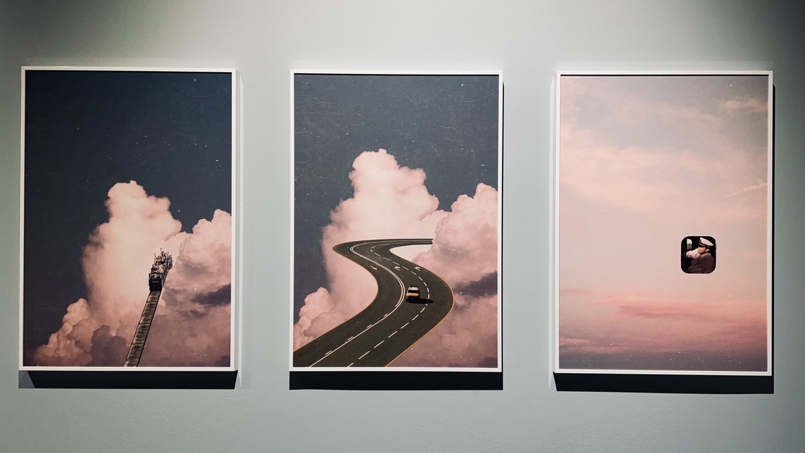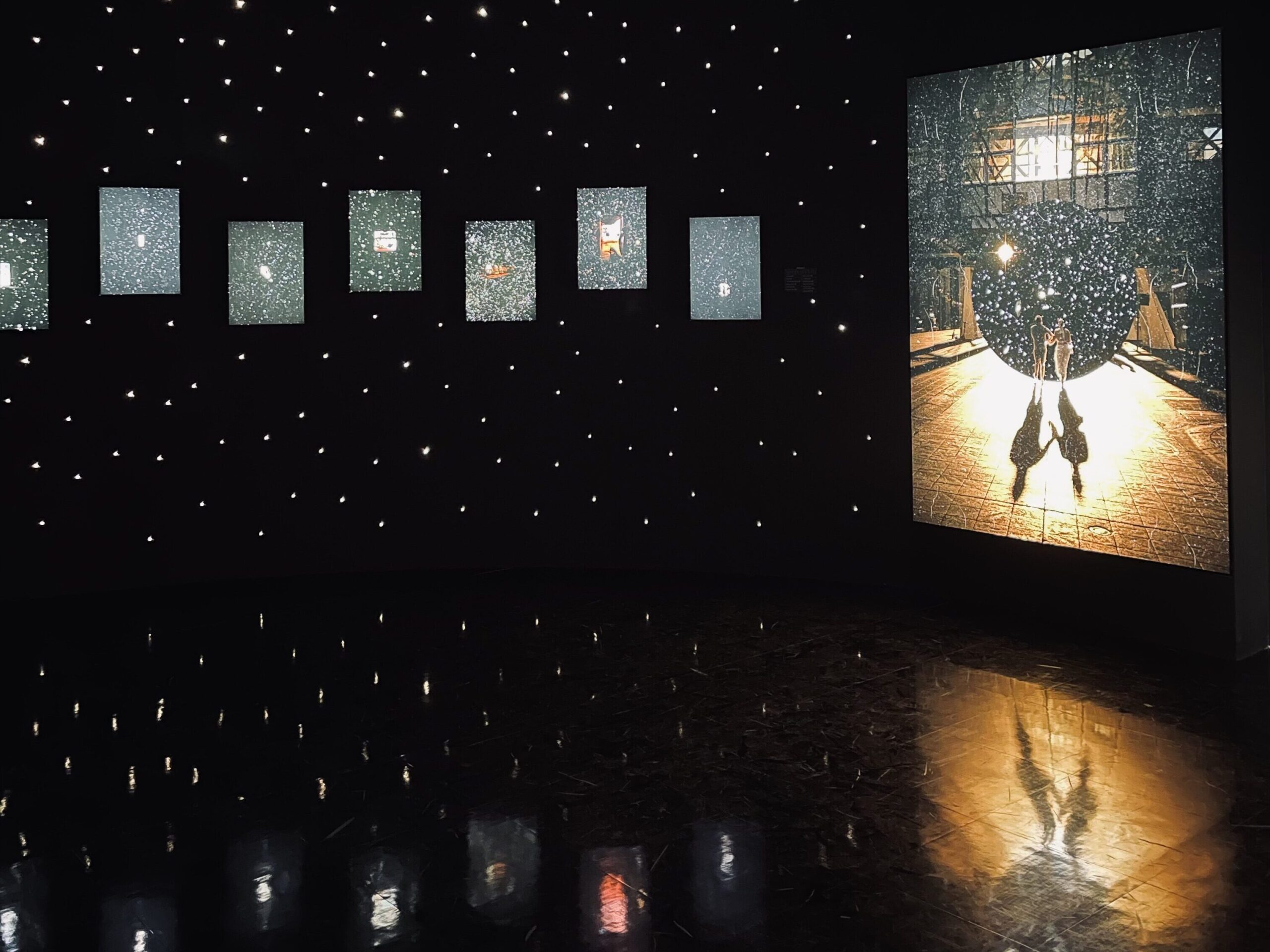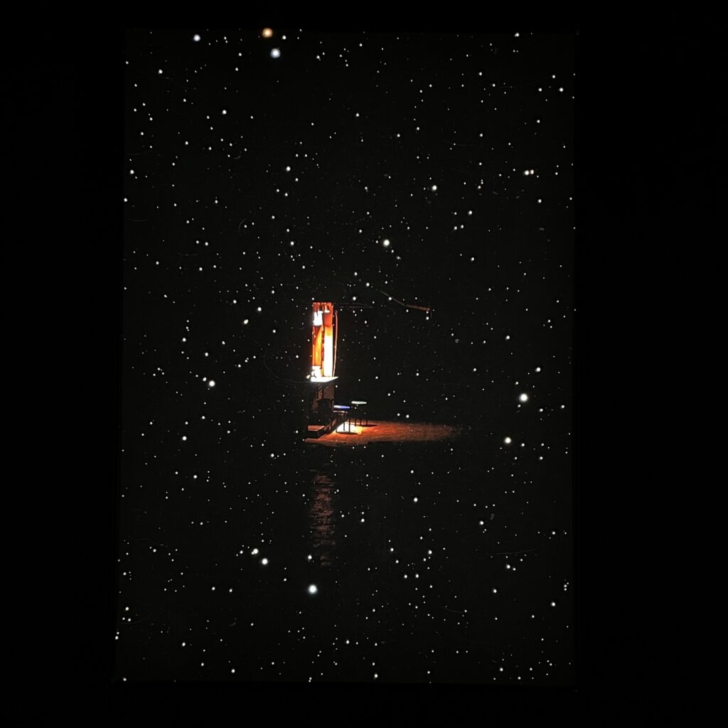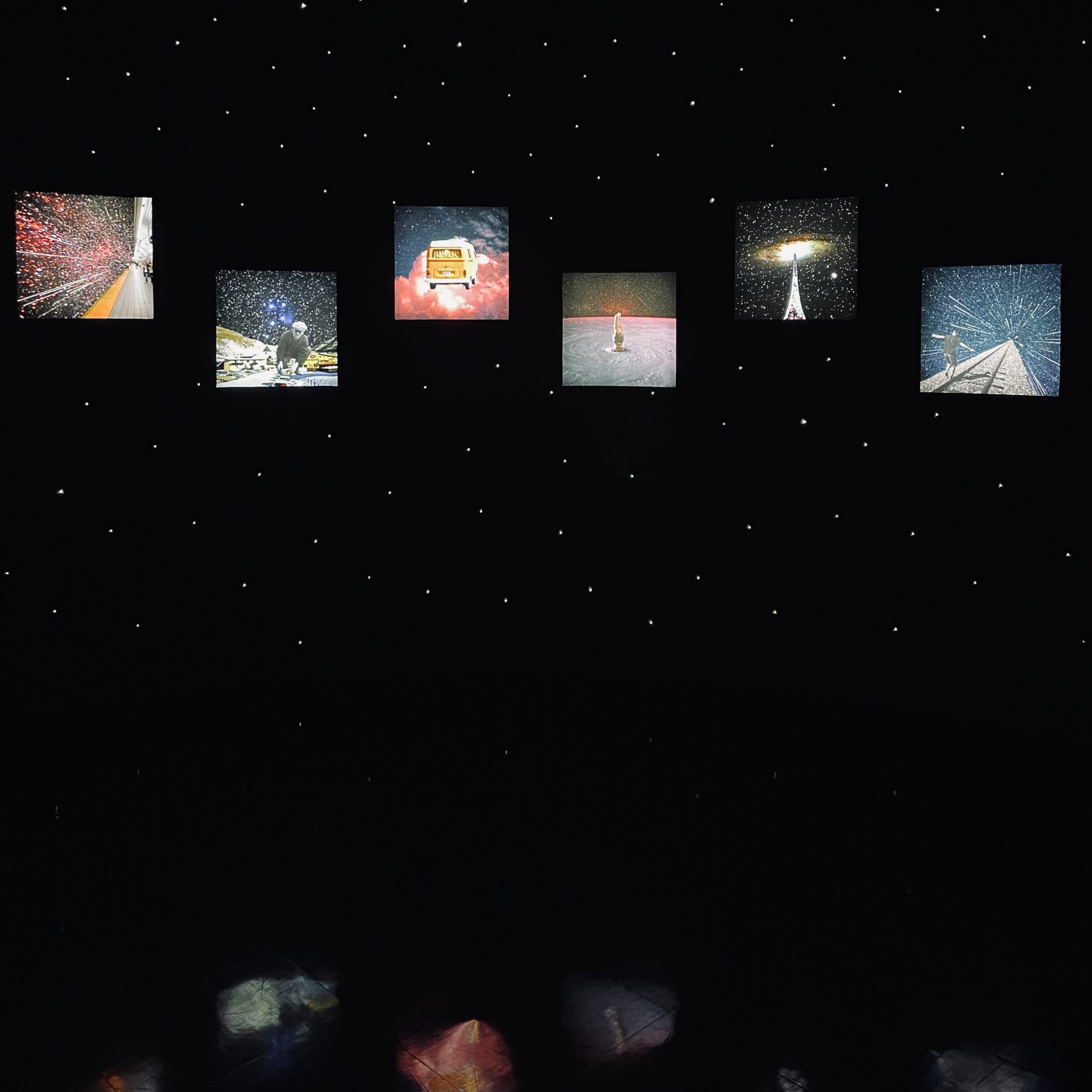 第二站是韓國藝術家Na Seungjun的展區,也是這次我個人最喜歡的部分。整個房間由上到下都是黑色的,畫作全是印在布上從背後打光的light box,,地板則有點反光材質,加上牆上裝置的無數小光點,這個展的開始可以說是非常宇宙。數位藝術家Na Seungjun利用拼貼的方式作畫,媒材大部分取自攝影照片,內容有一部分直接與宇宙的主題有關,一部分則其實非常日常,但他的構圖及拼貼手法加上展場的設計,真的讓人有置身在他所想像的宇宙裡的感覺;而且雖然作品大多都印的比較小,但簡潔的表現手法(畫作正中央的主角)以及詼諧又日常的概念(正要從地下鐵站走上樓梯的瞬間)和剩下畫面佈滿的星空,一方面非常寫實、一方面又好像是個天外飛來一筆的奇妙想像,相當令人印象深刻,是個既浪漫又有趣的而且非常切題的展區。