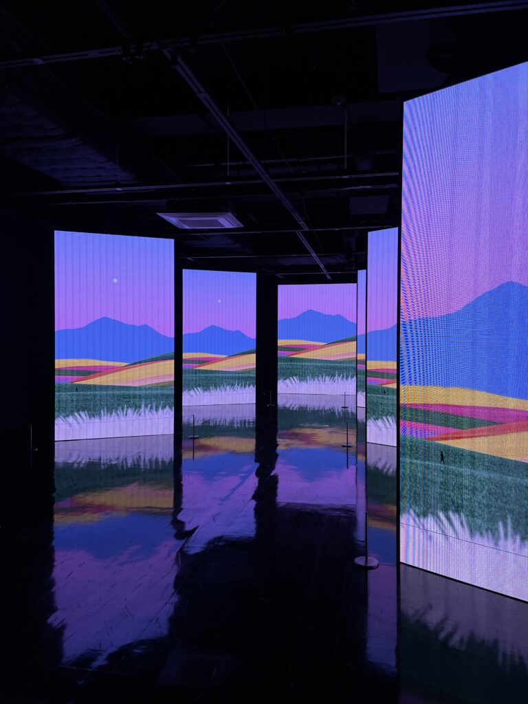 最後用好幾個大型LED panel及鏡面地板組成的展區是Andhika Ramadhian的展區。她的作品我自己覺得跟Jesse Stone有點類似,就是藝術家自己的創作風格蠻一致,在手機或平板上看時會覺得蠻有趣,再加上她玩的比例尺度算是蠻大的(畫作中人物非常小),所以在想樣的時候會覺得應該很適合利用像這次展覽一樣的大型LED展版來呈現,但事實上並不是這樣;她所創造出來的層次感反而被壓平、飽和的色調互相打架,讓畫作觀感失去深度,再加上這樣類似舞台側幕般的陳列方式看起來稍無新意,我自己覺得算是這次最可惜的幾組之一(也在想是不是錢跟資源都被前面的用光了哈哈哈哈)